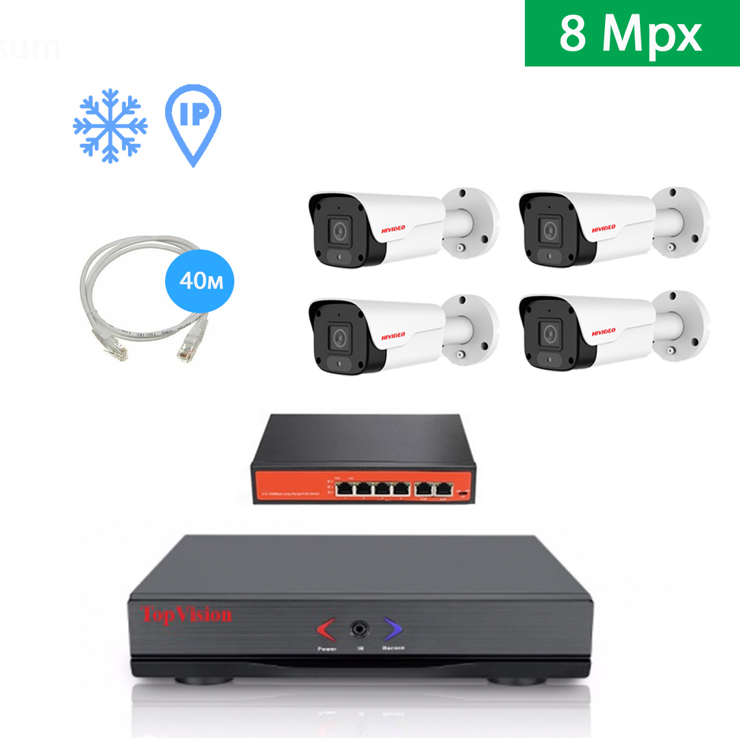 Полностью готовый к установке комплект видеонаблюдения, включает в себя все необходимое оборудование для самостоятельного монтажа, включая жесткий диск. IP видеорегистратор марки TopVision позволяет удаленно просматривать видео и смотреть архив записей из любого места в мире, где есть интернет. Современные IP видеокамеры ведут съемку в разрешении 8mpx и гарантируют высокое качество картинки как днем, так и ночью.